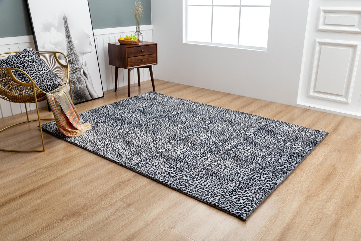The contemporary designed Faux Leopard Print area rug features 100% polyester with a grey cotton backing. The beautiful faux leopard print pattern gives it depth and character and allows for a wide range of styling options.