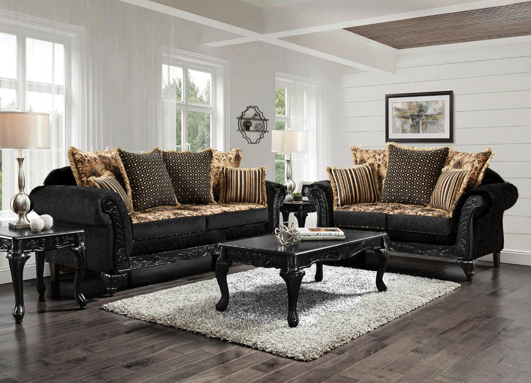 TRADITIONAL STYLING IN A MULTI FABRIC COMBINATION; REVERSIBLE SEAT CUSHIONS; TAN TAPESTRY TOP WITH BLACK FRONT FACE; MATCHING BLACK SHOW WOOD AND ORNATE BLACK LEGS; MATCHING CHAISE AVAILABLE; T235 MATCHING COCKTAIL TABLE & 2 ENDS ARE AVAILABLE;